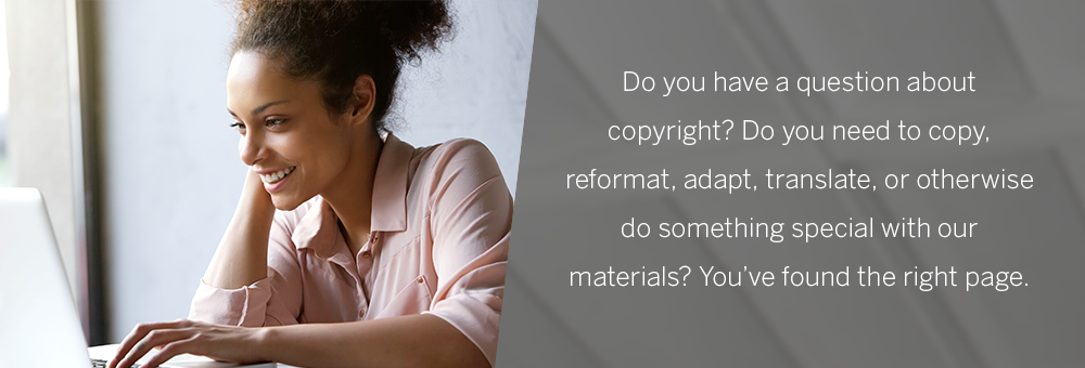 If you don’t find the information that addresses your particular question for WPS Rights & Permissions, please don’t hesitate to e-mail us at rights@wpspublish.com. Go ahead, challenge us!